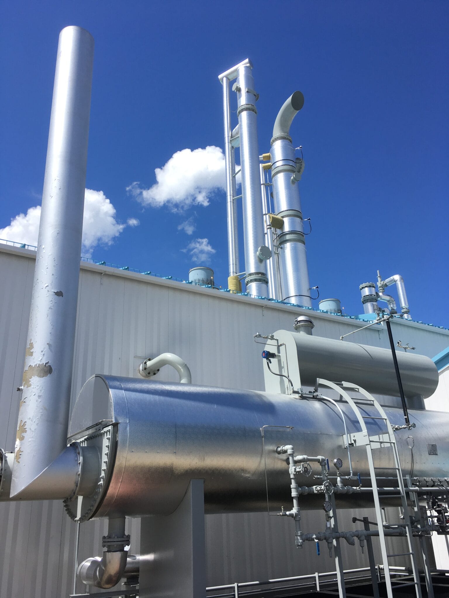 A slip stream of flue gas from the natural gas-fired boilers at the Enmax Shepard Energy Centre, an 860-MW combined cycle power plant, is sent to the capture system. This flue gas is first cooled prior to entering the CO2 extraction process. Flue gas then enters the CO2 gas absorber, through which the amine-based solvent is fed. Once absorbed, the CO2 gas is carried within the enriched solvent stream for CO2 recovery, while remaining products of combustion in the flue gas are vented off the top of the absorber tower. The solvent, enriched with CO2, passes to the stripper tower which uses re-boiled lean solvent combined with tower and structured packing material to liberate the CO2 gas from the enriched solvent stream. The exit CO2 gas from the stripper is produced at a controlled temperature and pressure and provided as a final product stream consisting of saturated CO2 at a nominal maximum rate of 6 tonne/day.